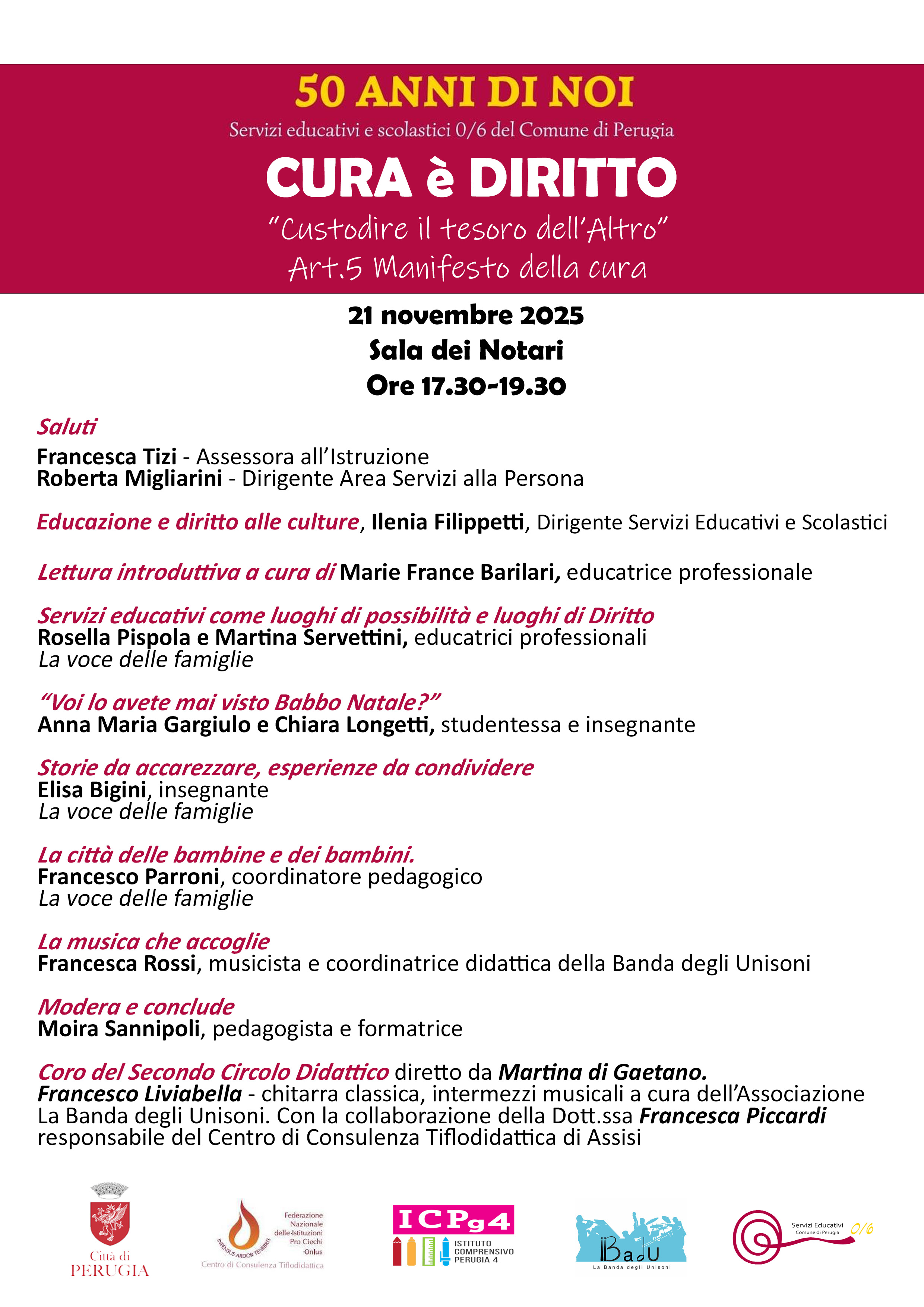 In occasione della settimana che celebra i Diritti dell’Infanzia e dell’Adolescenza, il 21 novembre 2025 dalle 17.30 alle 19.30, si terrà presso la Sala dei Notari di Perugia il Seminario dal titolo Cura è Diritto, organizzato dai Servizi educativi e scolastisci del Comune di Perugia, in collaborazione con la Banda degli Unisoni, il centro di Consulenza Tiflodidattica di Assisi, l’Istituto Comprensivo Perugia 4 e il Secondo Circolo Didattico con il Coro dei bambini e delle bambine. Il seminario, moderato dalla Prof.ssa Moira Sannipoli, si inserisce nell'ambito della celebrazione dei 50 anni di servizi educativi 0/6.